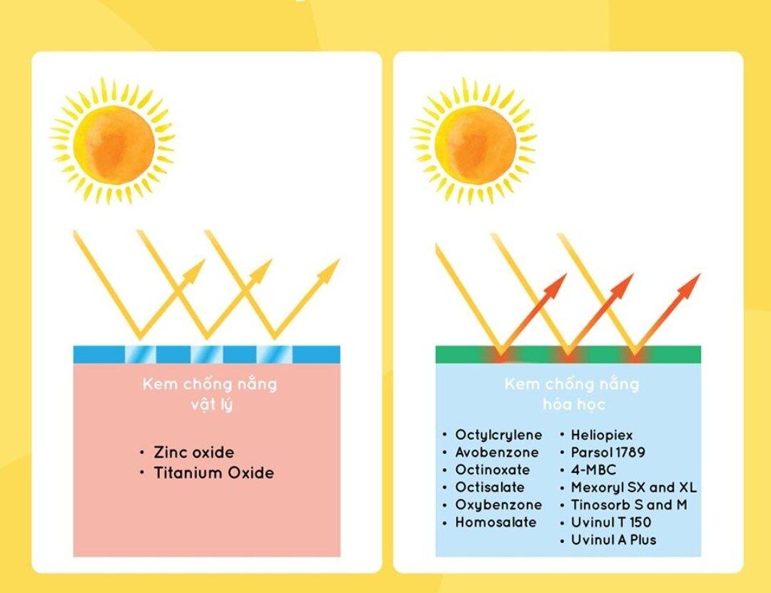 Kem chống nắng vật lý nằm trên da và ngăn chặn những tia cực tím tiếp xúc trực tiếp với da. Loại kem này được tập hợp các hạt khoáng là zinc oxide và titanium dioxide tạo nên một hàng rào vật lý phản xạ lại các bức xạ từ mặt trời, đẩy bật chúng về môi trường. Chúng có khả năng phản xạ hổ rộng (kể cả UVA và UVB)